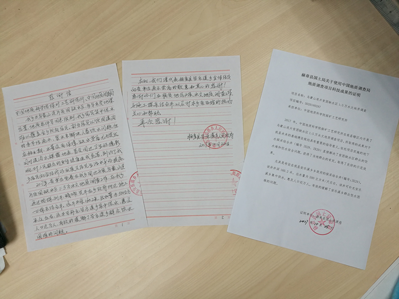 當(dāng)?shù)卣謩e給實施該項目的中國地質(zhì)調(diào)查局、中國地質(zhì)科學(xué)院探礦工藝研究所以及我院授予錦旗,并親筆手寫感謝信,感謝項目組在脫貧地區(qū)開展水文地質(zhì)調(diào)查和施工探采結(jié)合井工作,以及對地方老百姓的熱切關(guān)心和幫助。