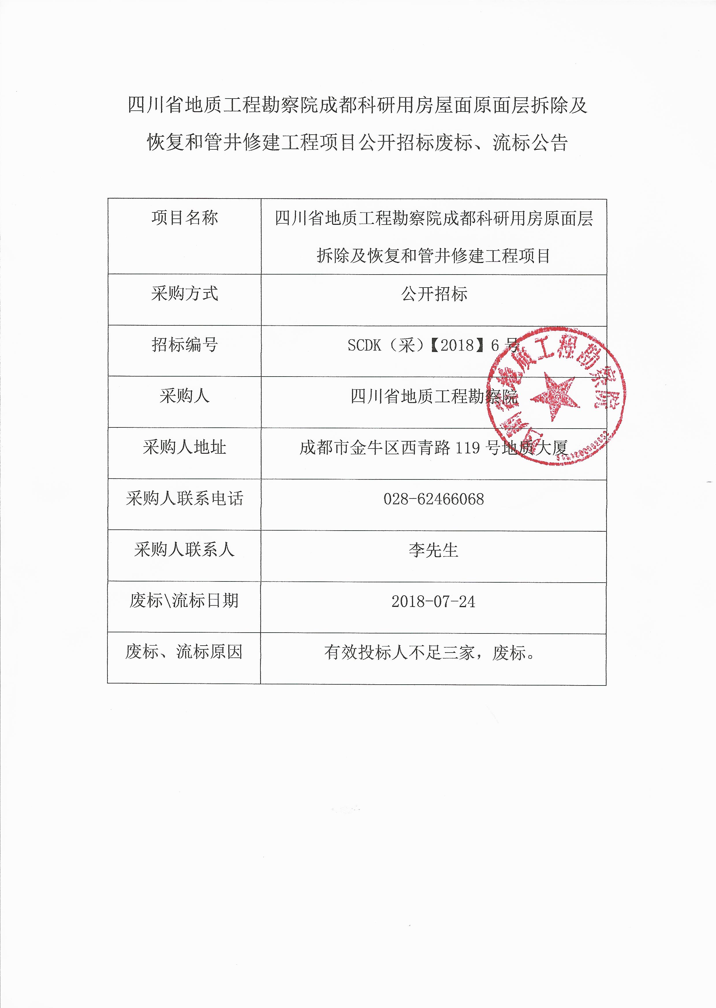 四川省地質工程勘察院成都科研用房屋面原面層拆除及恢復和管井修建工程項目公開招標廢標、流標公告